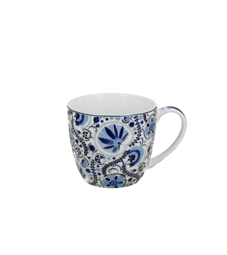 Kubek 460 ml w „koszyczku” NARESH BLUE wchodzący w skład linii ETHNIC, wykonany z porcelany New Bone China, charakteryzującej się elegancką i naturalną kremowo – białą barwą z delikatnym połyskiem a także wyjątkową wytrzymałością przy zachowaniu lekkości i delikatności.