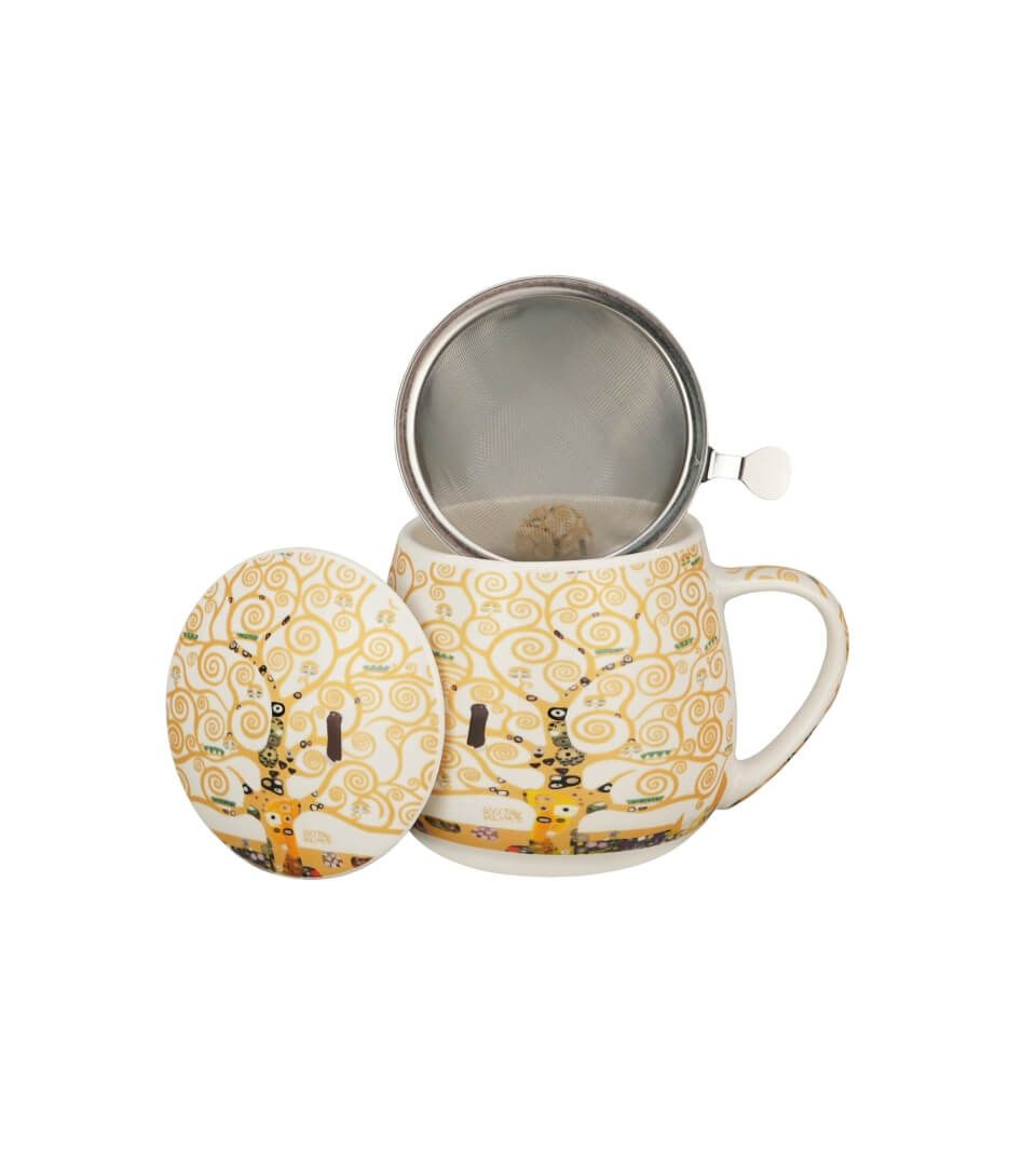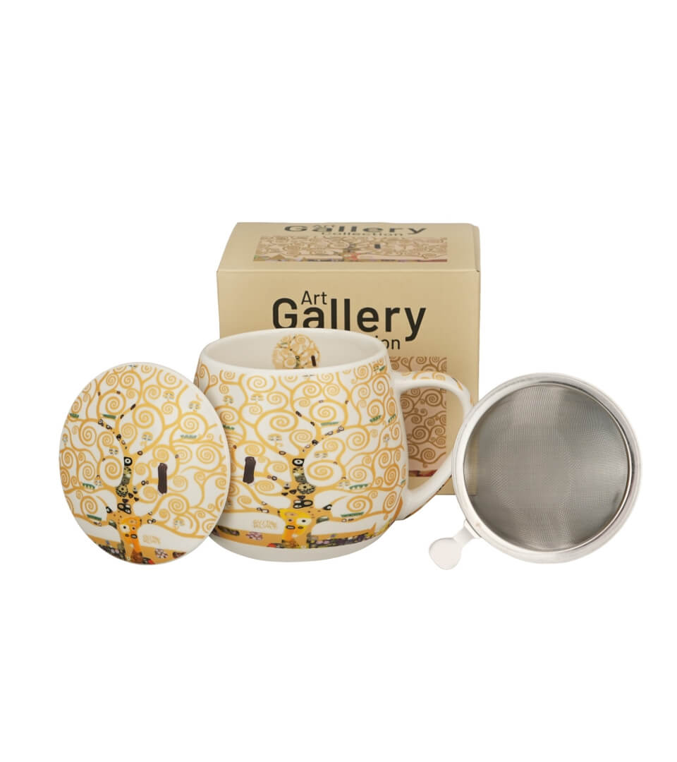 Kubek baryłka 430 ml z zaparzaczem i pokrywką TREE OF LIFE by Gustav Klimt wchodzący w skład serii Art Gallery, wykonany z porcelany New Bone China, charakteryzującej się elegancką i naturalną kremowo – białą barwą z delikatnym połyskiem, a także wyjątkową wytrzymałością.