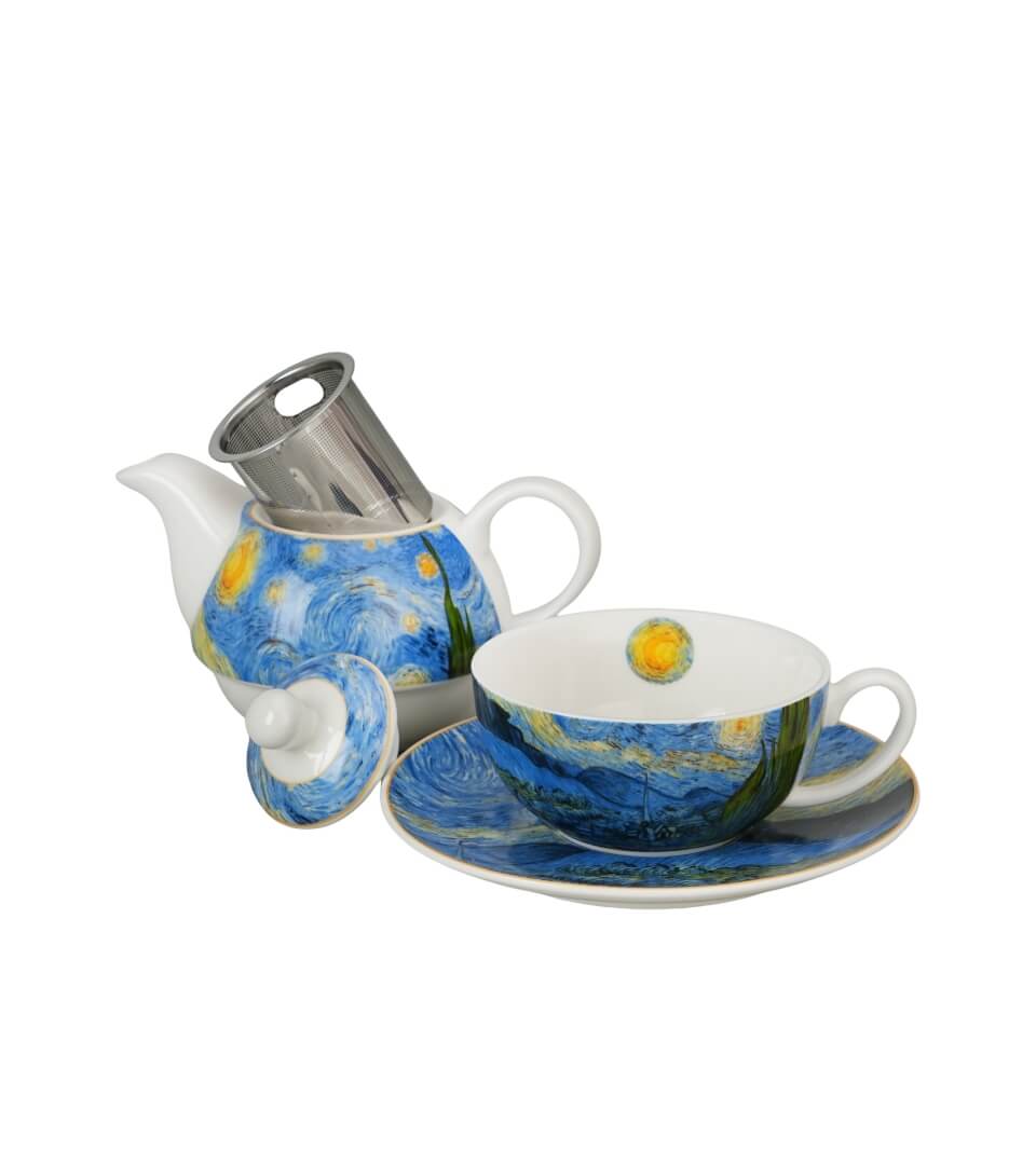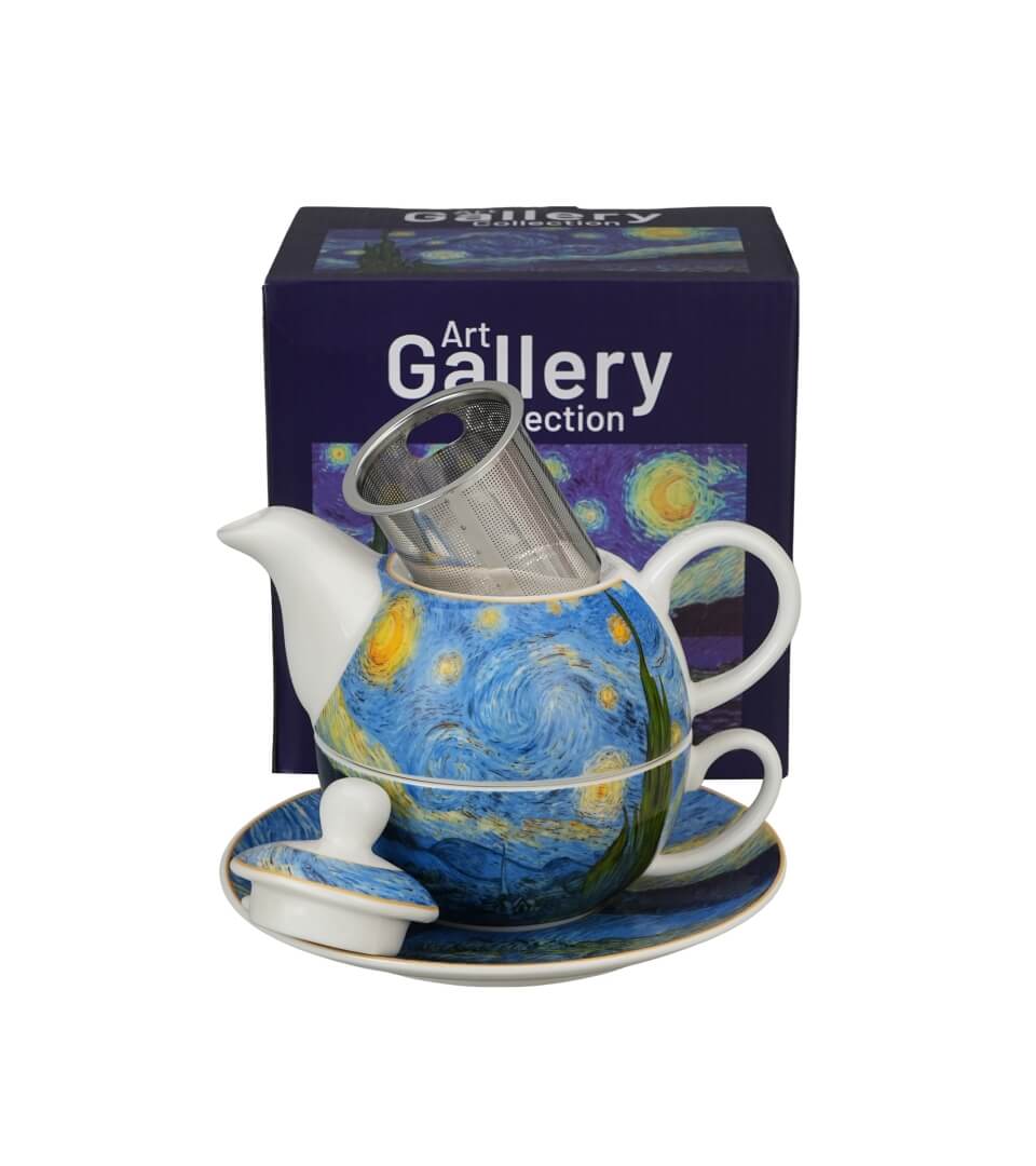 Filiżanka z dzbankiem i zaparzaczem STARRY NIGHT inspired by V. van Gogh wchodząca w skład serii Art Gallery, wykonana z porcelany New Bone China, charakteryzującej się elegancką i naturalną kremowo – białą barwą z delikatnym połyskiem, a także wyjątkową wytrzymałością, zachowując jednocześnie lekkość i finezję.