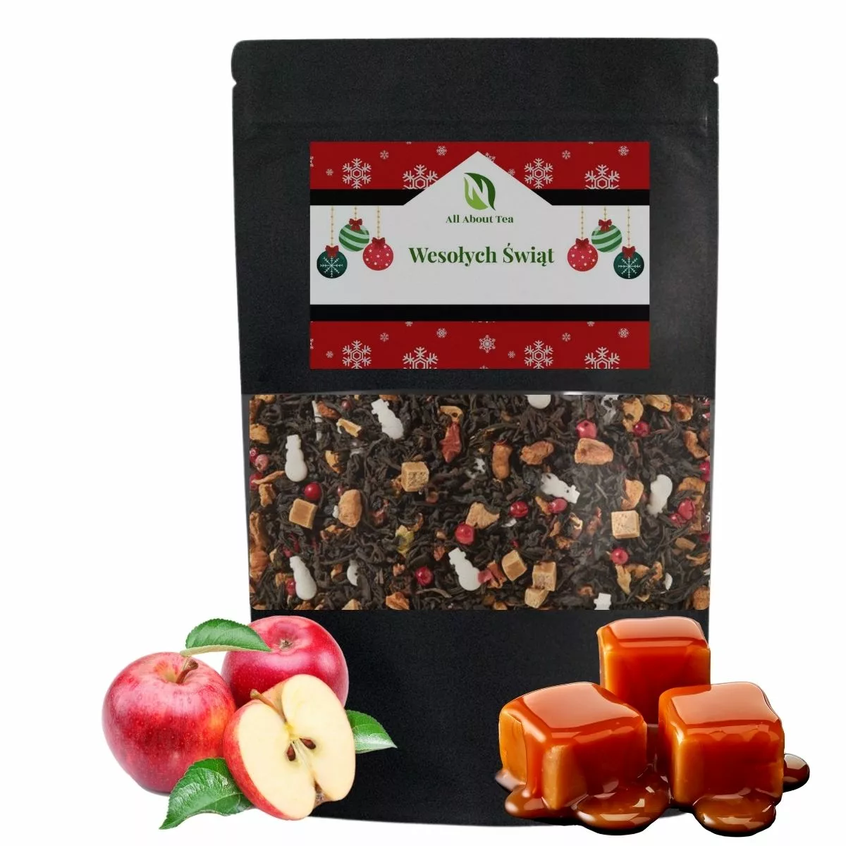 Wyjątkowe jabłko w lukrze. Mieszanka czarnej herbaty z dodatkiem świątecznego jabłka, pokryta delikatną, korzenną polewą karmelową. Wystarczy słodki i kremowy toffi oraz pieczone jabłko z przyprawami, a każdy bałwanek rozpłynie się w powietrzu.
