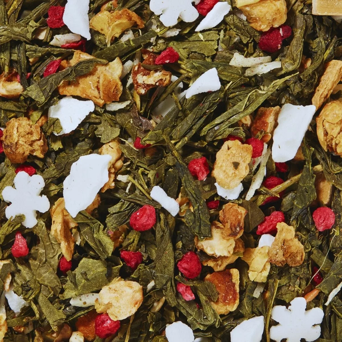 Gdy na zewnątrz delikatnie pada śnieg, czas na filiżankę dobrej herbaty. Ta świąteczna mieszanka zielonej herbaty urzeka owocowym, aksamitnym smakiem malin, świeżej śmietanki i delikatnego karmelu. Chrupiący jogurt lśni niczym świeżo spadły śnieg, a kryształki lodu w lukrze nadają filiżance zimową atmosferę. Ta herbata smakuje jak przytulne wieczory przy kominku, pod ulubionym kocem i w ciszy zimowej magii.