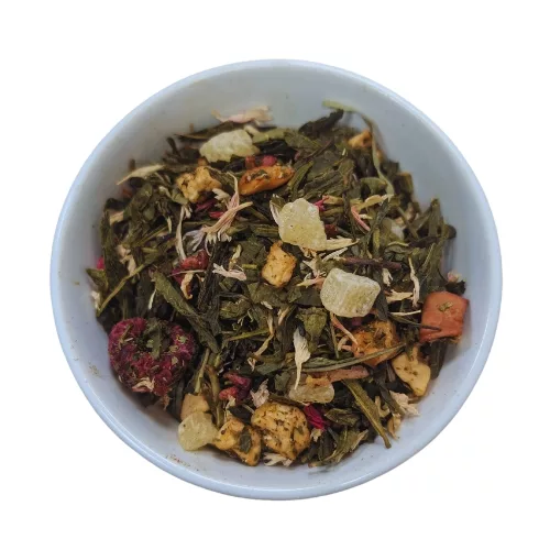 Składniki: herbata zielona (60%), kostki ananasa (ananas, cukier), kostki jabłka, aromat, liofilizowane kawałki malin, liofilizowane całe maliny, kwiaty różowego chabra