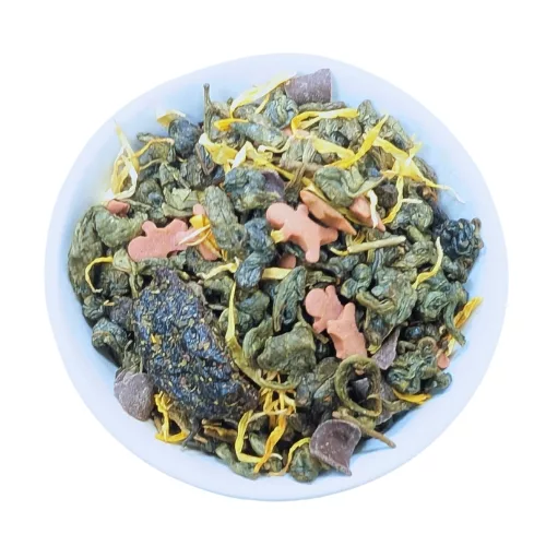 Składniki: Gunpowder China, dekoracje cukrowe (cukier, mąka ryżowa, olej ryżowy, skrobia ziemniaczana,aromat, barwnik: E101), śliwka (śliwka suszona, olej słonecznikowy, substancja konserwująca sorbinian potasu,, CZEKOLADA (miazga kakaowa, cukier, tłuszcz kakaowy, olej maślany /mleko/, emulgator E322 /soja/,aromat, nagietek, aromat