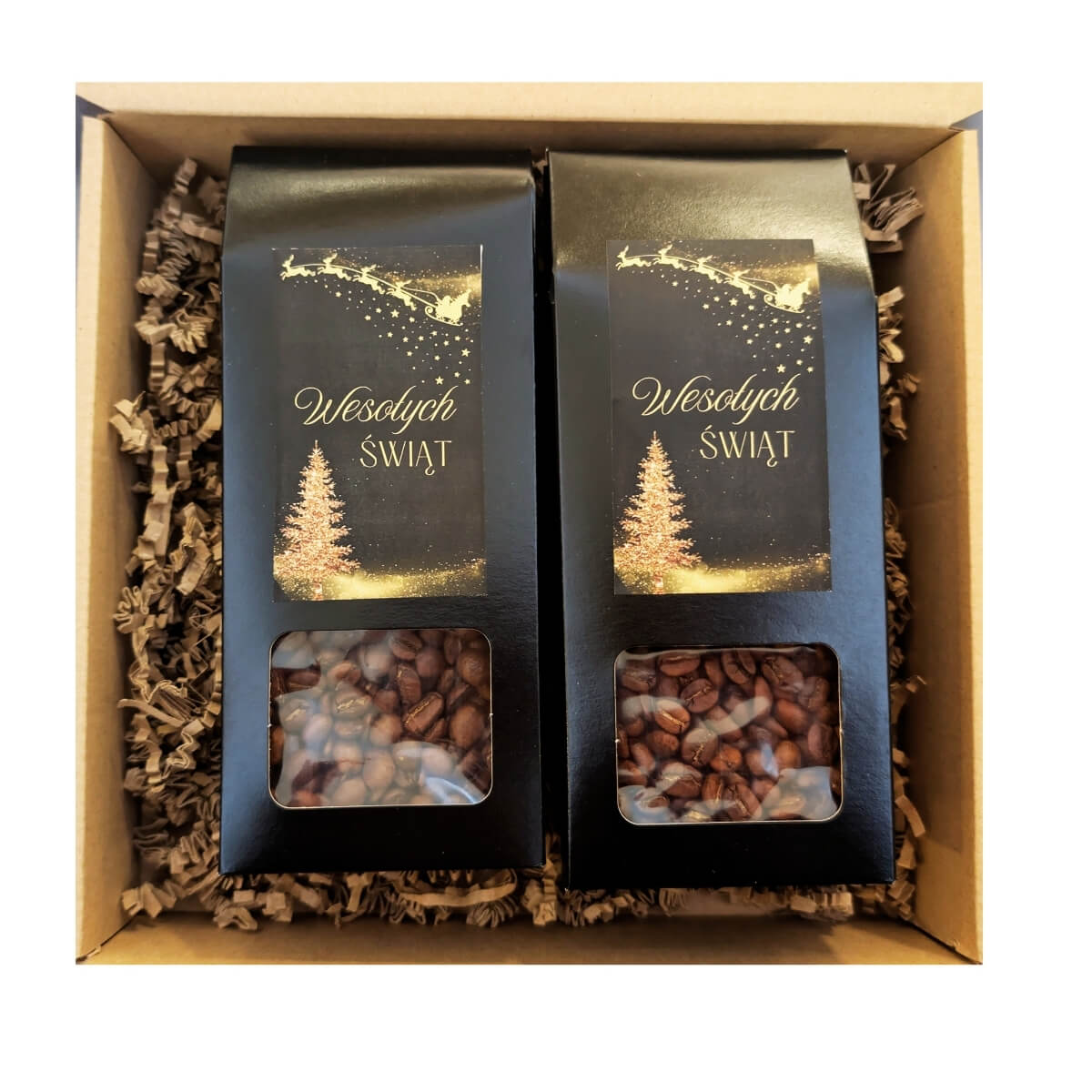 - Kawy spakowane są w przezroczystą torebkę, z tyłu znajduje się etykieta określająca rodzaj kawy. Etykieta ze składem znajduje się na dnie torebki. Woreczek z kawą umieszczony jest w pudełku z okienkiem. Z przodu znajduje się świąteczna etykieta.