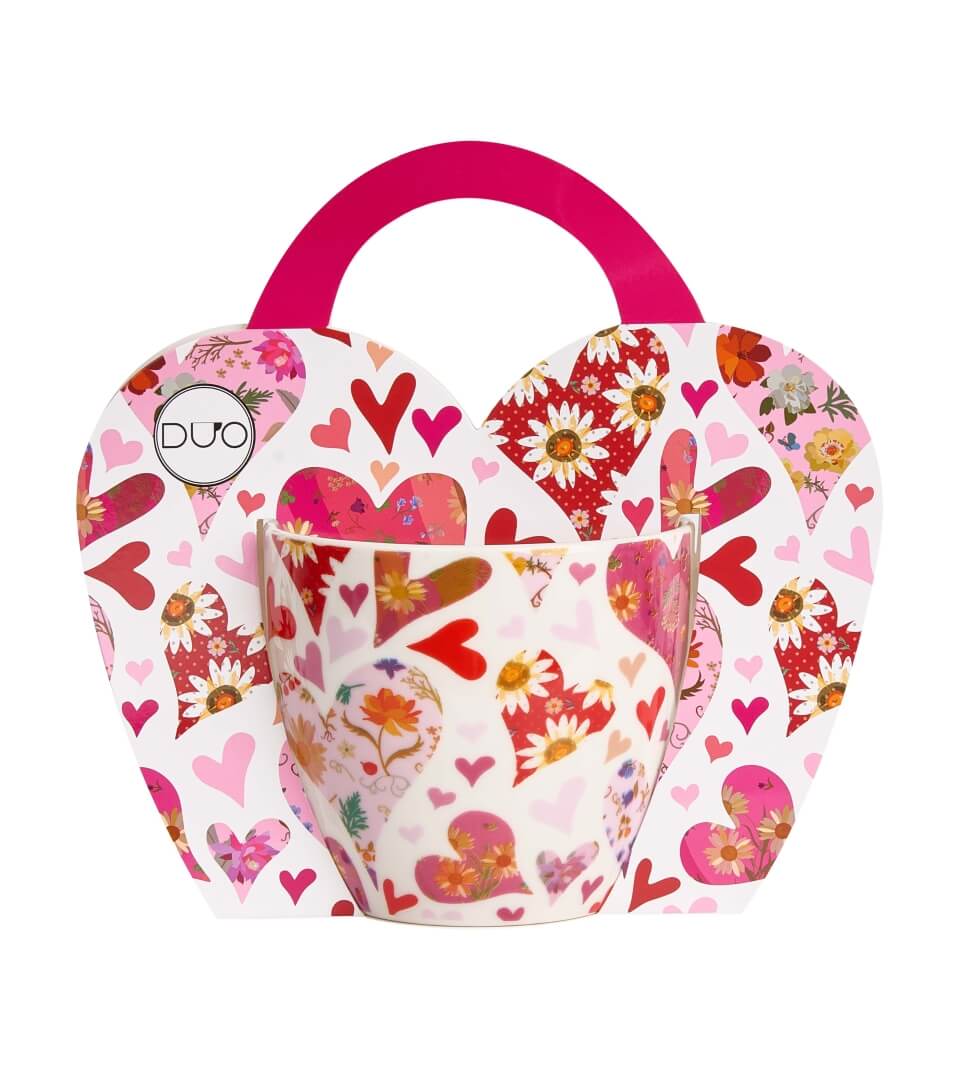 Kubek 460 ml w “koszyczku” RÓŻOWE SERCA wchodzący w skład serii SERCA, charakteryzuje się naturalnym kremowo-białym kolorem z delikatnym połyskiem oraz wyjątkową wytrzymałością i trwałością, zachowując lekkość i finezję.