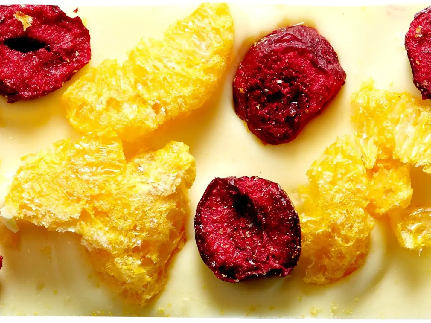 Czekolada biała bez dodatku cukru z owocami liofilizowanymi (mandarynka, wiśnia). Czekolada zawiera substancję słodzącą oraz naturalnie występujące cukry. Składniki: czekolada biała (substancja słodząca: maltitol, tłuszcz kakaowy, mleko pełne w proszku, emulgator: lecytyna sojowa, naturalny aromat wanilinowy), mandarynka liofilizowana (2,8%), wiśnia liofilizowana (2,8%). Spożycie w nadmiernych ilościach może mieć efekt przeczyszczający.