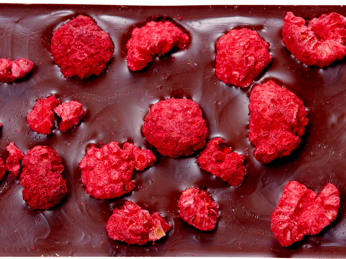 Składniki: czekolada deserowa bio (miazga kakaowa bio, cukier trzcinowy bio, tłuszcz kakaowy bio, emulgator: lecytyna sojowa bio), malina liofilizowana bio (5,7%). Masa kakaowa minimum 56,5%