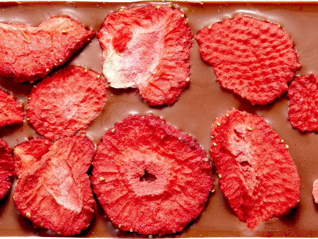 Składniki: czekolada mleczna bio (cukier trzcinowy bio, tłuszcz kakaowy bio, mleko pełne bio w proszku, miazga kakaowa bio, emulgator: lecytyna sojowa bio), truskawka liofilizowana bio (5,7%). Masa kakaowa minimum 38,8%