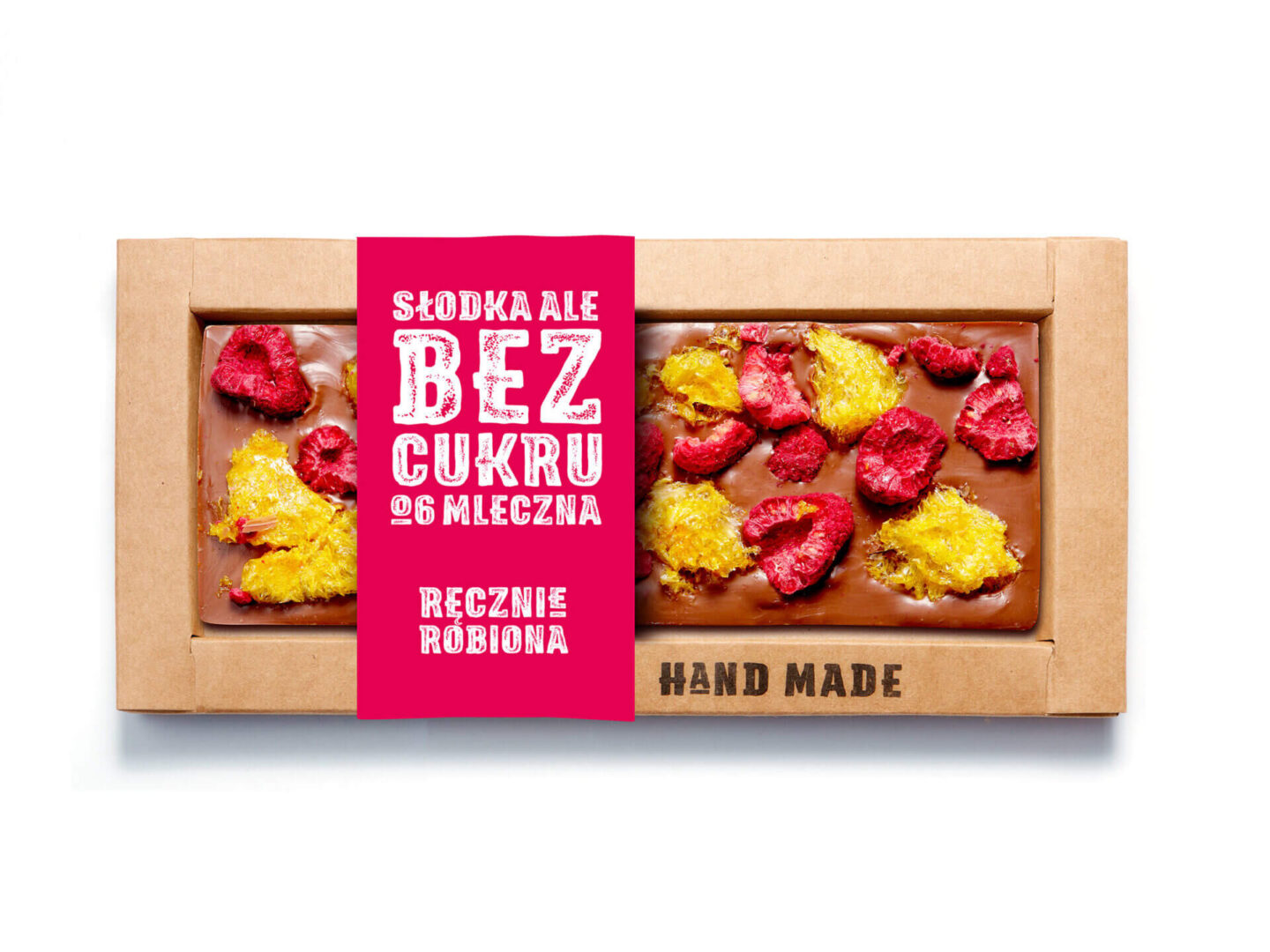 Pyszna i zdrowa wersja uwielbianego przysmaku każdego miłośnika czekolad. Mleczna czekolada bez cukru z idealnie skomponowanymi składnikami to niepowtarzalny smak i doznania wizualne, które doceni każdy. W każdej tabliczce czekolady znajdziecie zanurzone, duże kawałki maliny i mandarynki.