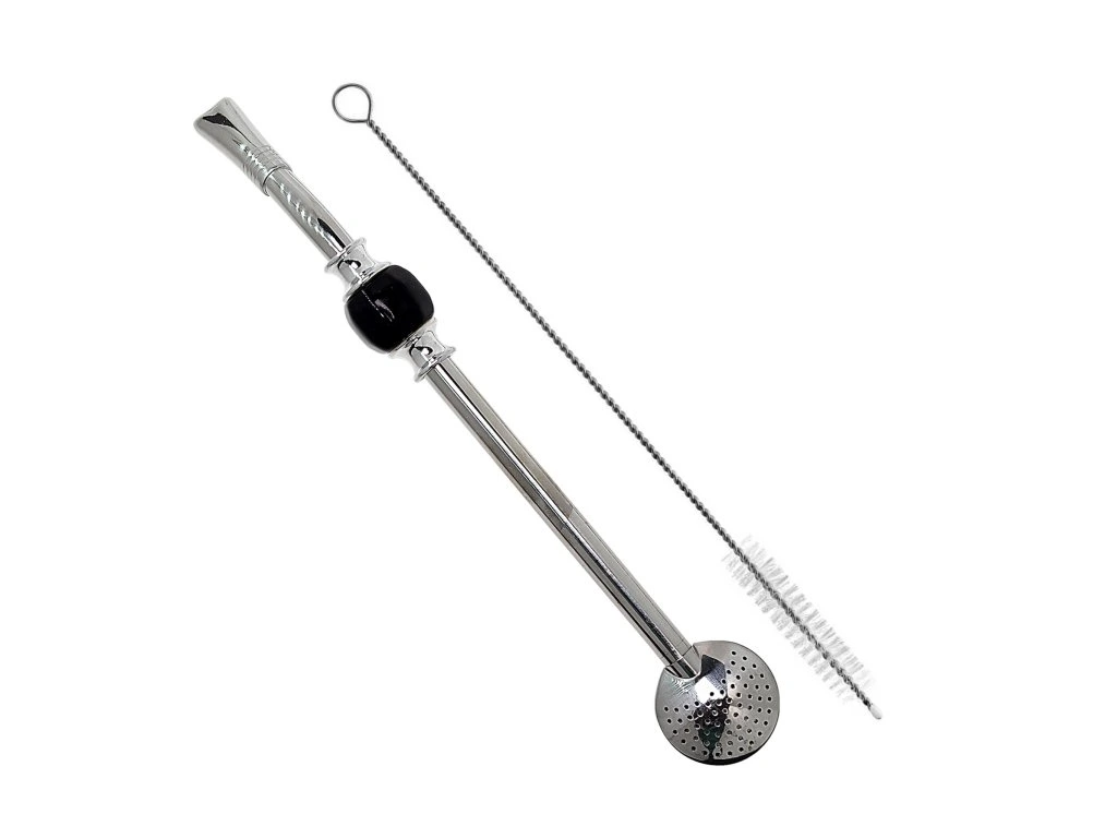 Bombilla z czarnym kamieniem, o długości 21 cm, wykonana ze stali nierdzewnej + szczoteczka do czyszczenia w pudełku.